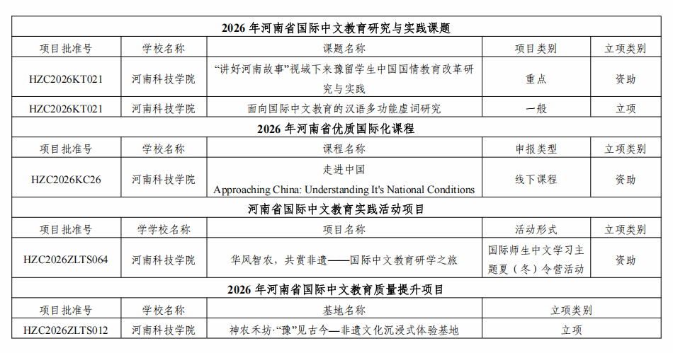 近日,河南省教育厅正式公布2026年河南省优质国际化课程及相关项目立项名单,我校宋培杰等五位老师主持的项目分别获得资助与立项支持。