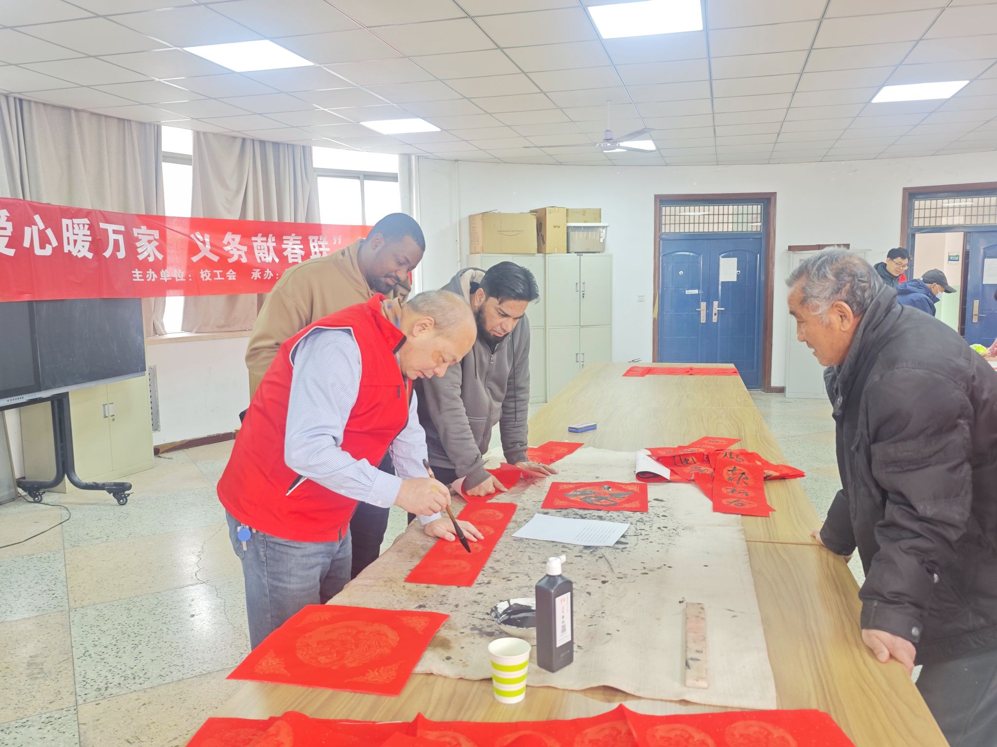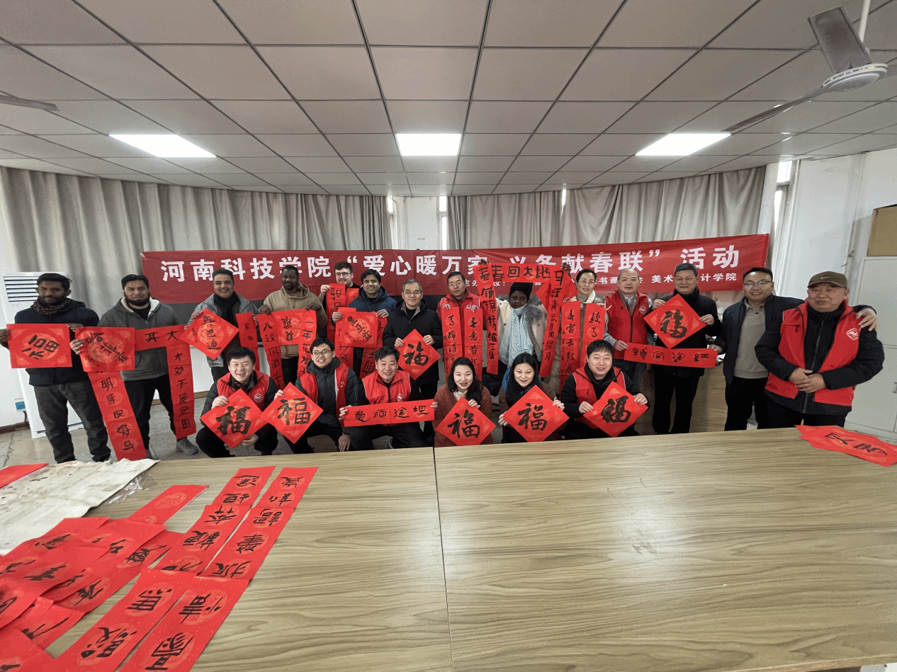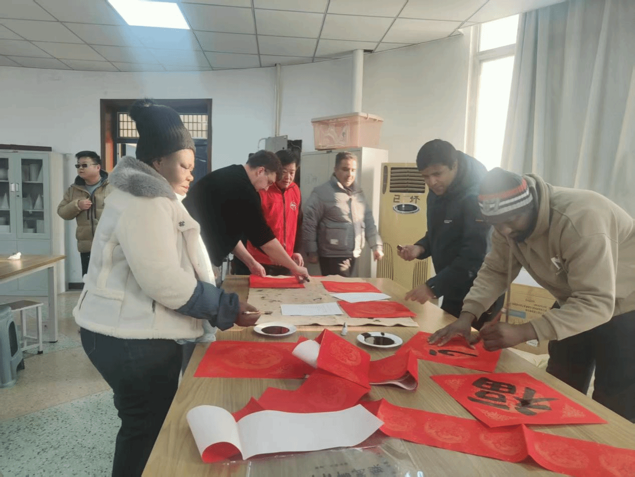 1月21日,国际交流与合作处组织外籍教师,参与由校工会主办、校书画协会及美术与设计学院承办的“爱心暖万家、义务献春联”活动,校党委副书记王庆兵莅临现场指导。来自英国、巴基斯坦、喀麦隆和尼日利亚等地的6名外籍教师与我校书法家们携手体验中国文化,迎接新春佳节。