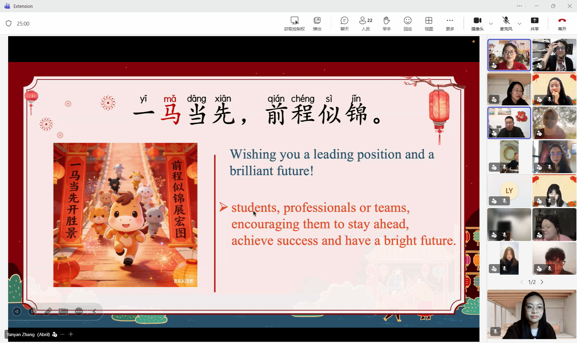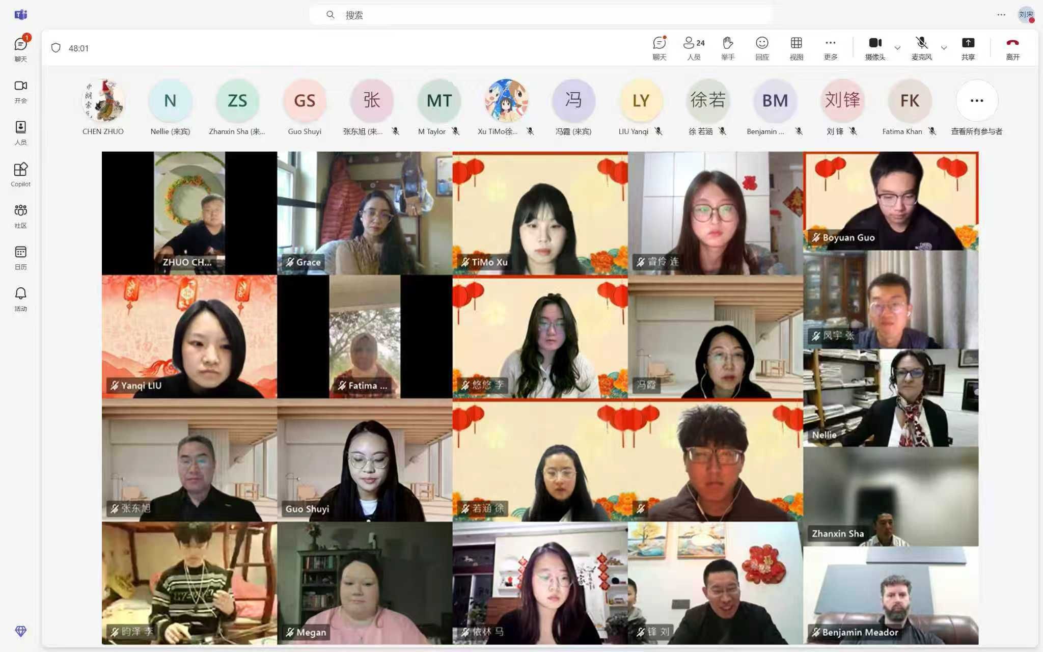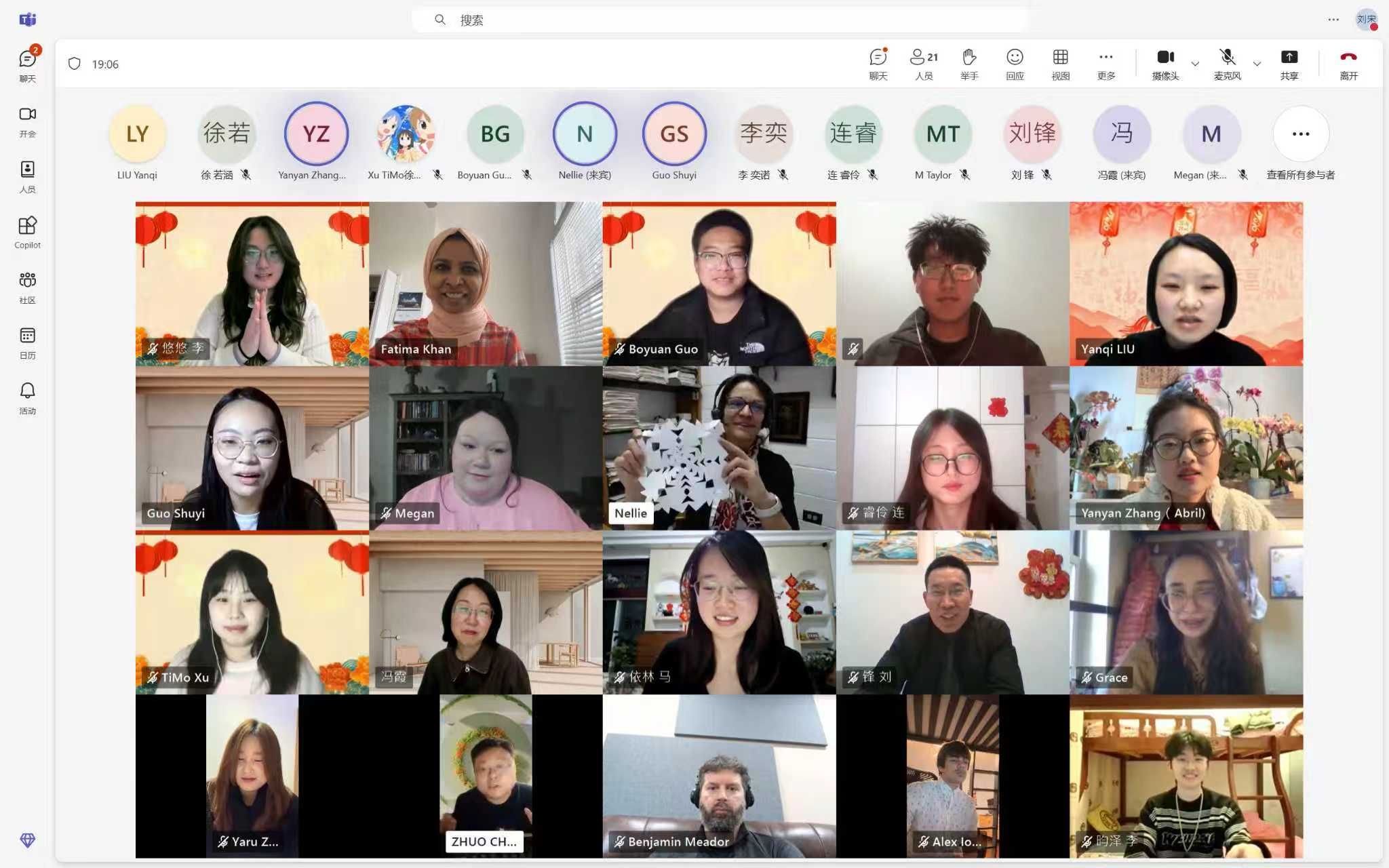 联欢环节精彩纷呈:豫剧选段、二胡名曲《赛马》赢得阵阵掌声;写对联、剪福字、生肖灯谜竞猜等互动点燃全场热情;新春美食分享环节,中美师生互展家乡年味与圣诞美食,在云端共品文化风味。活动尾声,全体师生打开摄像头拍摄“云端大合影”,齐声祝福“春节快乐”,定格友谊瞬间。