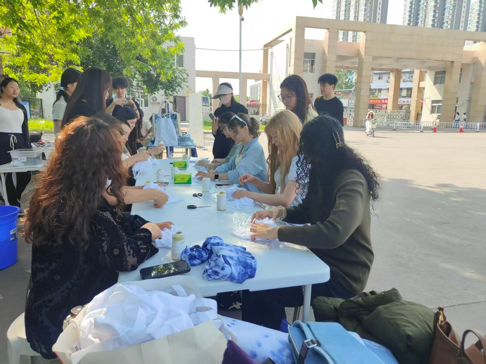 外籍师生们兴致高昂、积极参与,沉浸式体验蓝染制作的全过程。他们认真模仿折叠、捆扎布料的手法,小心翼翼地将布料浸入靛蓝色染液中,在一次次浸染、晾晒、氧化中,见证白布逐渐晕染成雅致靛蓝的奇妙变化,脸上满是惊喜与期待。现场氛围热烈融洽,中外师生相互交流制作心得,分享对蓝染技艺的喜爱,在动手实践中亲身感受中国传统手工艺的独特魅力。